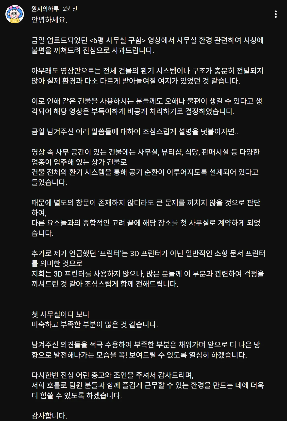 가까운 사람들 말로는 건물 전체가 한꺼번에 공기를 순환시키는 시스템으로 설계됐다고 들었다고 해. 창문이 없어도 큰 문제 없을 거라고들 했지만, 실제로는 어쩐지 숨이 턱 막히는 느낌이 들었다는 사람도 있더라. 또 영상에서 언급된 프린터 얘기처럼 작은 사무용 기기가 분위기에 영향을 준다느니 하는 소문도 돌았고. 비공개 처리된 영상이라는 얘기도 오가고, 이는 추가 설명 없이 남겨진 부분이 많다는 뜻일 수 있어.