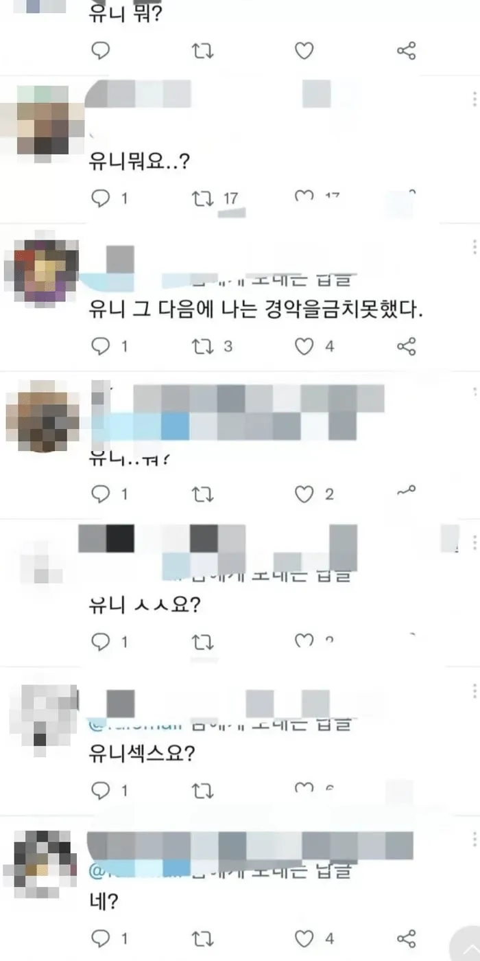 유니섹스를 '유니 성관계'로 해석한 것으로 보인다.