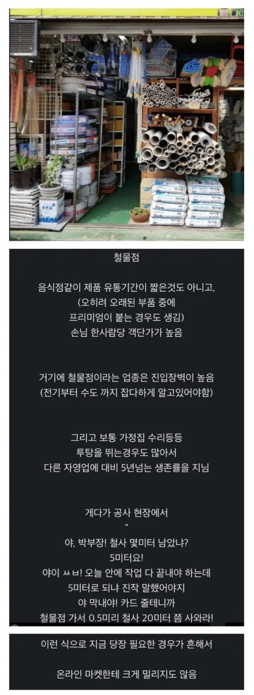 동네 사람들 말에 의하면 자영업 중에서도 철물점이 의외로 버티는 편이래. 온라인 마켓이 커지는 거 다 알지만 현장에서 바로 필요한 걸 땡겨 쓰는 분위기는 아직 남아 있는 모양이야. 건물 수리나 작은 공사를 하다 보면 즉시 필요한 재료가 늘 있어야 하니까. 그래서인지 폐업 얘기가 생각보다 많이 들리지 않는다는 말도 나오더라.