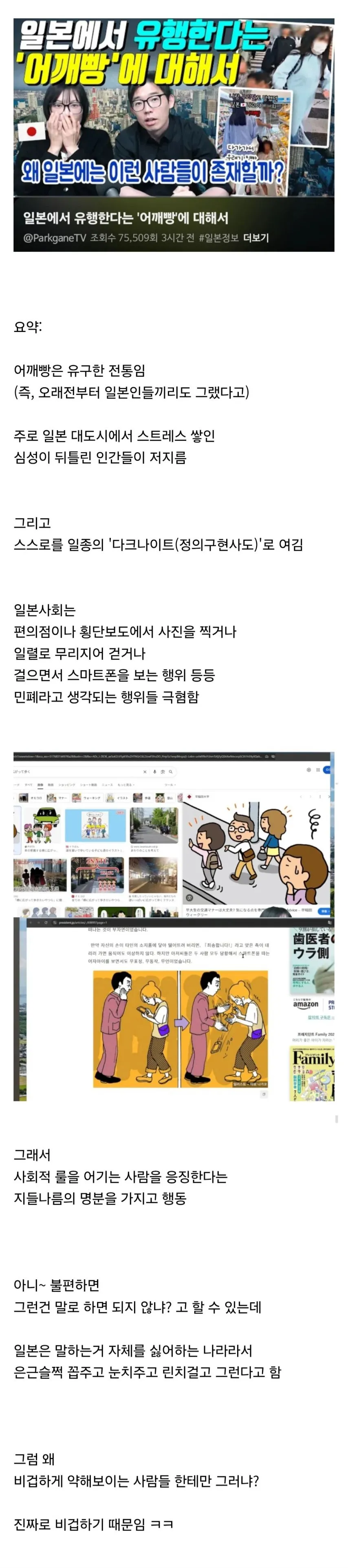 거리에서 어깨빵 얘기가 새삼 퍼지기 시작했어. 일본에서 유행한다는 소문도 같이 들리더라. 사람들이 내놓은 반응은 제각각인데, 일부는 스트레스 해소의 한 방법 같다고 하고, 다른 한 쪽은 그냥 지나가는 일이더라는 식이었지.