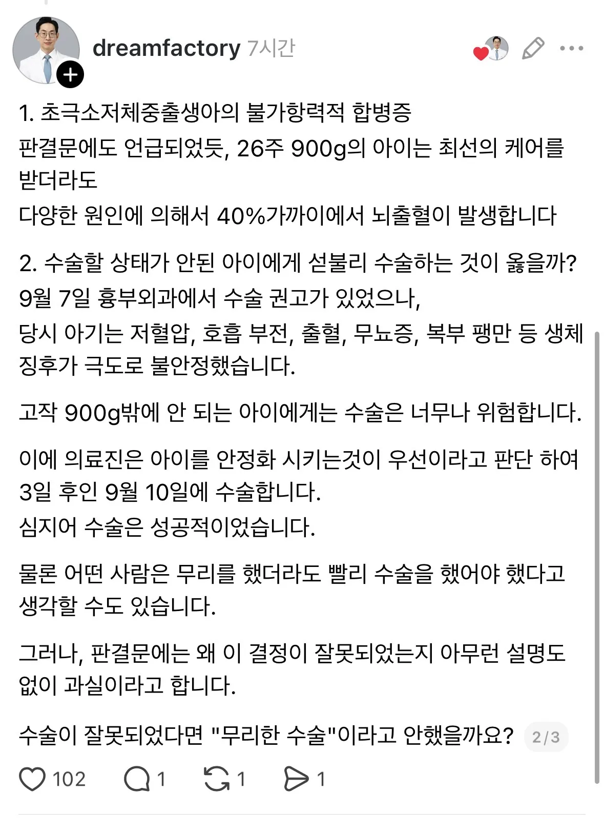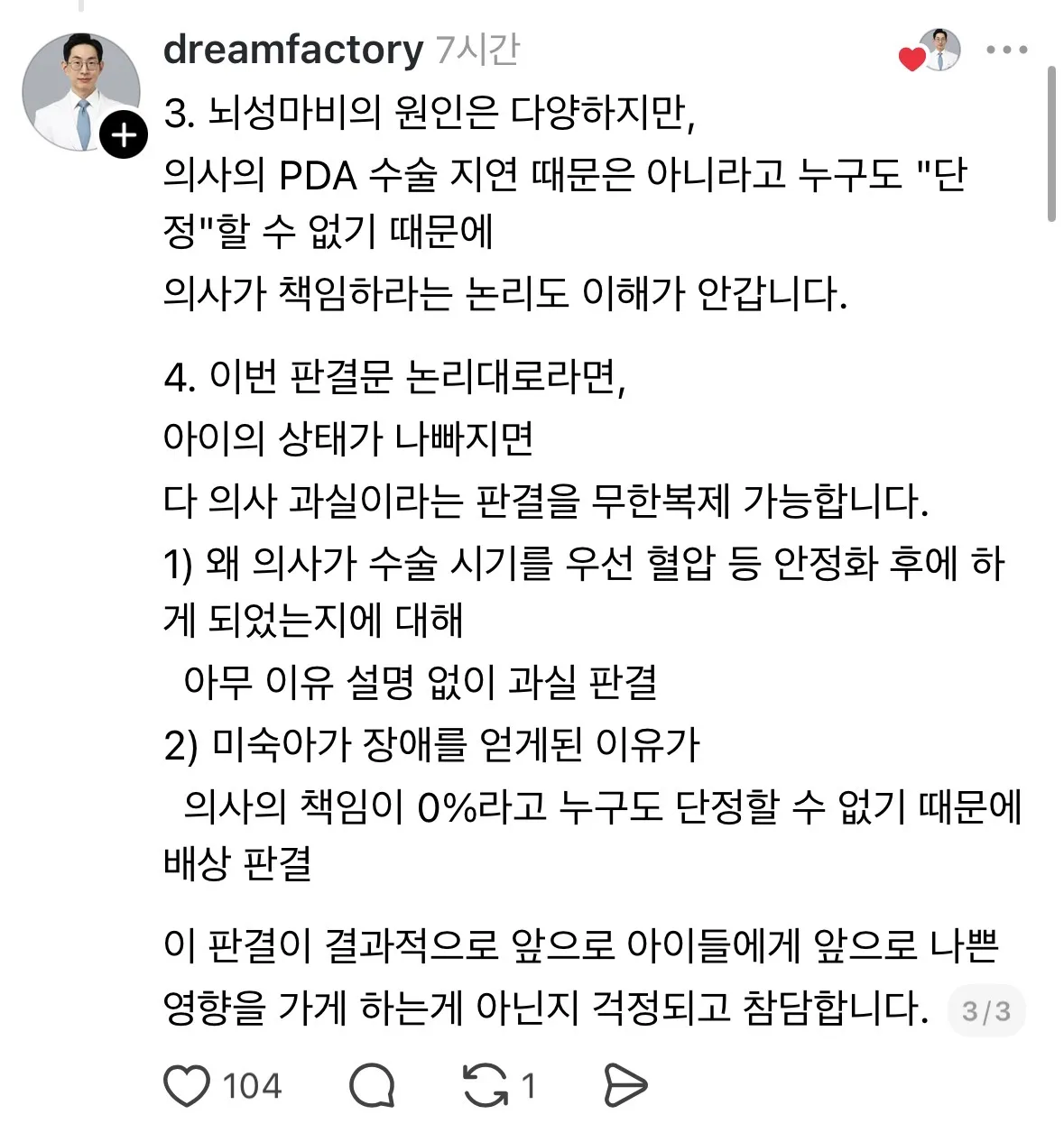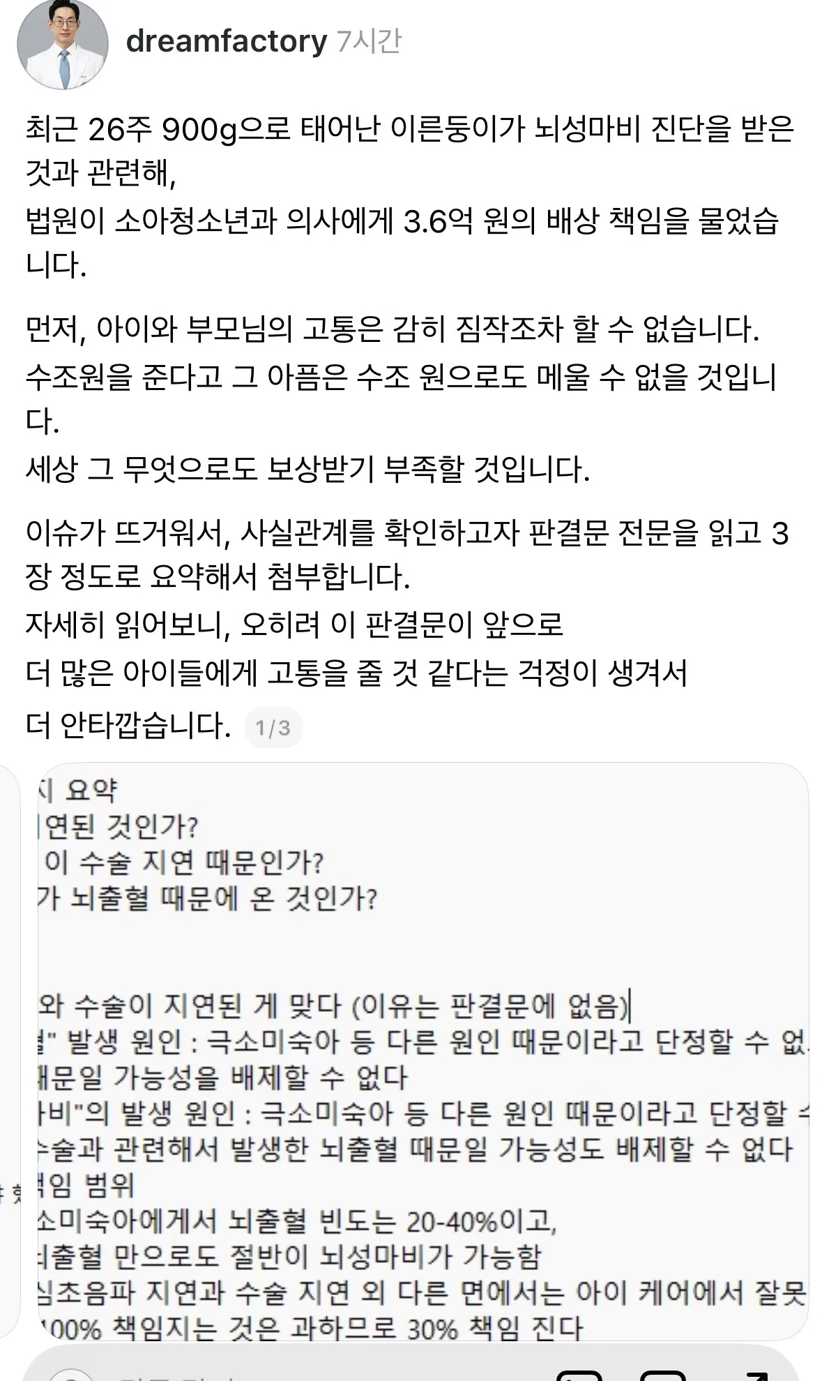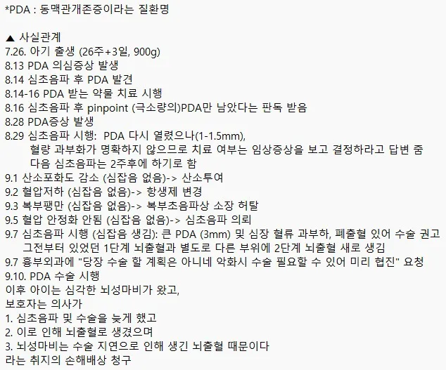 26주 900g 미숙아 뇌성마비 관련 배상 판결 얘기가 우리 동네에서도 핫하게 돌고 있어. 판결에서 초미숙아의 동맥관개존증(PDA) 수술과 뇌출혈, 뇌성마비 사이의 인과를 둘러싼 해석이 난무하더라. 이건 앞으로 어떤 아이들에게도 영향을 줄 수 있을 거 같아. 그럴수록 부모와 의료진의 입장이 달라지는 지점이 더 눈에 띄는 거 같아.