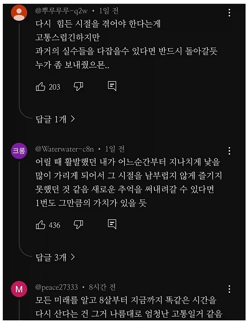 난 솔직히 말해서 이 생각이 주는 감정이 엇갈려. 과거의 추억이 그리워지기도 하고, 지금의 책임감을 어디에 두고 살아야 하나 헷갈리기도 해. 가족 이야기가 많이 거론되는데, 어릴 적 엄마 아빠의 모습이 갑자기 생각나고, 그때 다정했던 순간들이 이렇게 소중하게 느껴질 줄 몰랐거든. 그때의 작은 행복이 지금의 나를 어떻게 키운 걸까 생각도 들어.