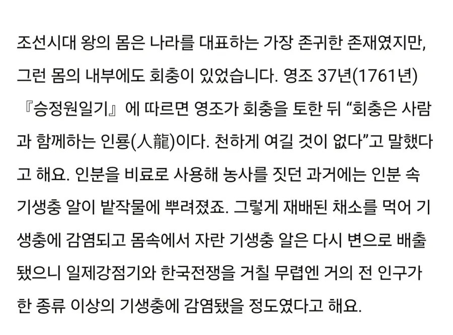 조선 시대 왕의 위생환경 얘기가 요즘도 자주 회자되는데, 왜 이리 말들이 많을지 한참 궁금해. 영조 같은 왕이 회충 얘기로 떠올랐다는 기록 조각들이 남아 있는데, 그건 당시 위생 문제를 암시하는 단서 같기도 해. 회충 같은 기생충 얘기가 기록 속에 자주 등장하니, 그 시절 사람들의 삶이 단순 불편함 이상이었을 거라는 느낌이 들더라.