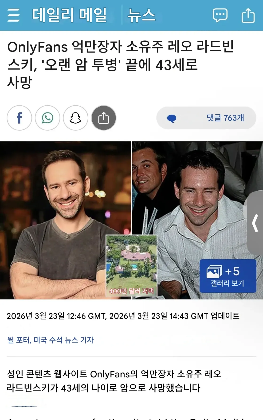 온리팬스의 억만장자 소유주가 암투병 끝에 43세의 나이로 세상을 떠났다는 소문이 오늘 갑자기 빠르게 퍼지고 있어. 사실 여부는 아직 확정되지 않았지만, 기사와 댓글이 뒤섞이며 다양한 추측이 쏟아지는 중이야. 이런 소문이 퍼지자 저택과 재산 얘기가 벌써 대화의 중심에 서는 걸 보면, 뭔가 큰 그림이 있는 건가 하는 느낌도 든다.