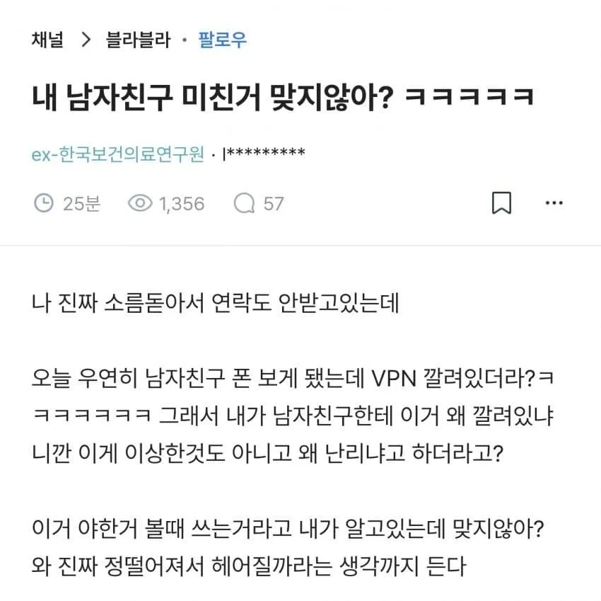 남친 핸드폰에 VPN 같은 게 깔려 있는 걸 우연히 보게 됐어. 이게 왜 필요하다는 건지 잘 모르겠고, 뭔가 찜찜한 느낌이 자꾸 들더라. 우리 사이가 숨 쉴 틈이 점점 없어지는 듯한 기분도 들고 말이야. 이게 그냥 내 불안일까, 아니면 뭔가 비밀이 있는 걸까?