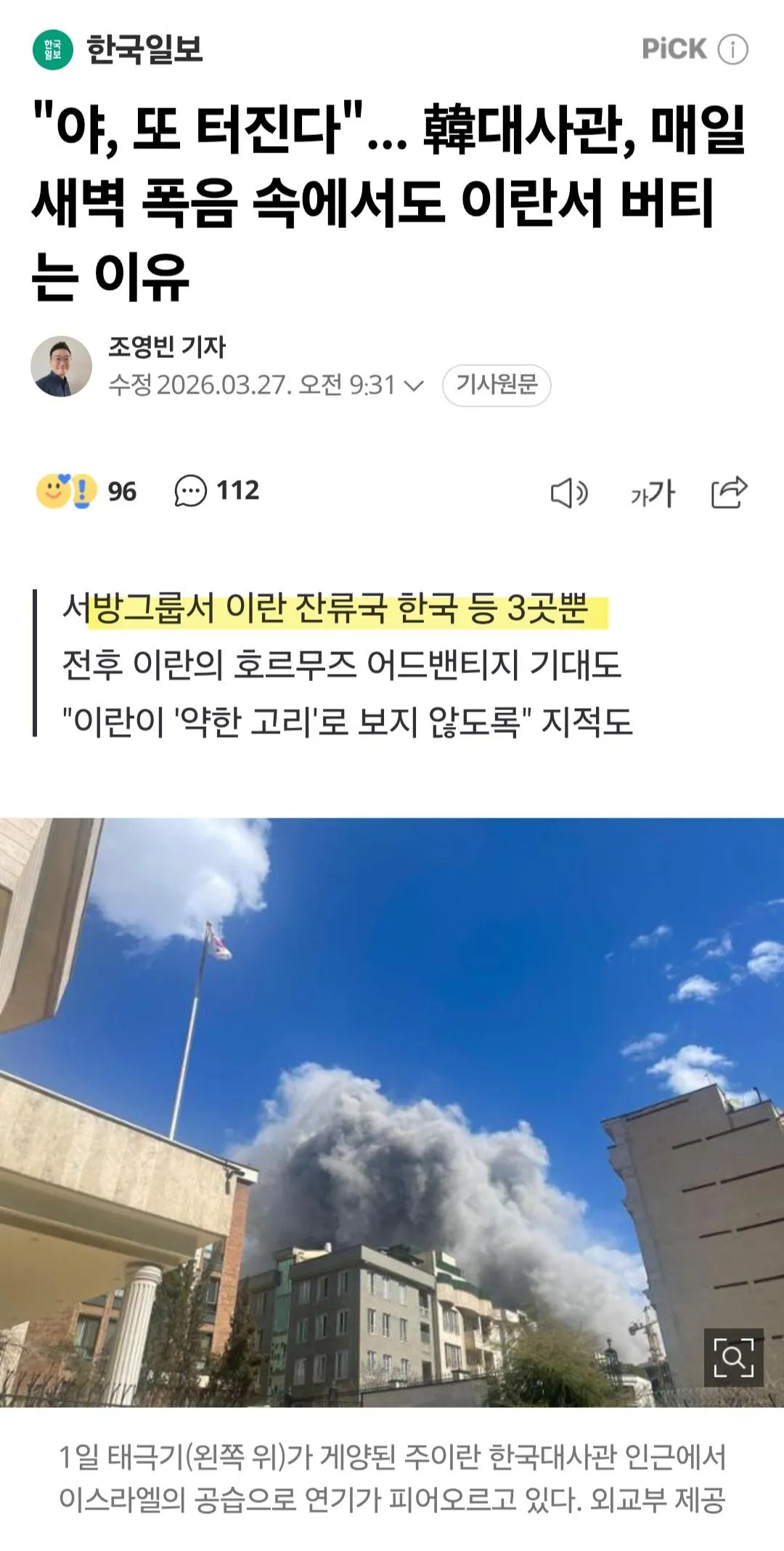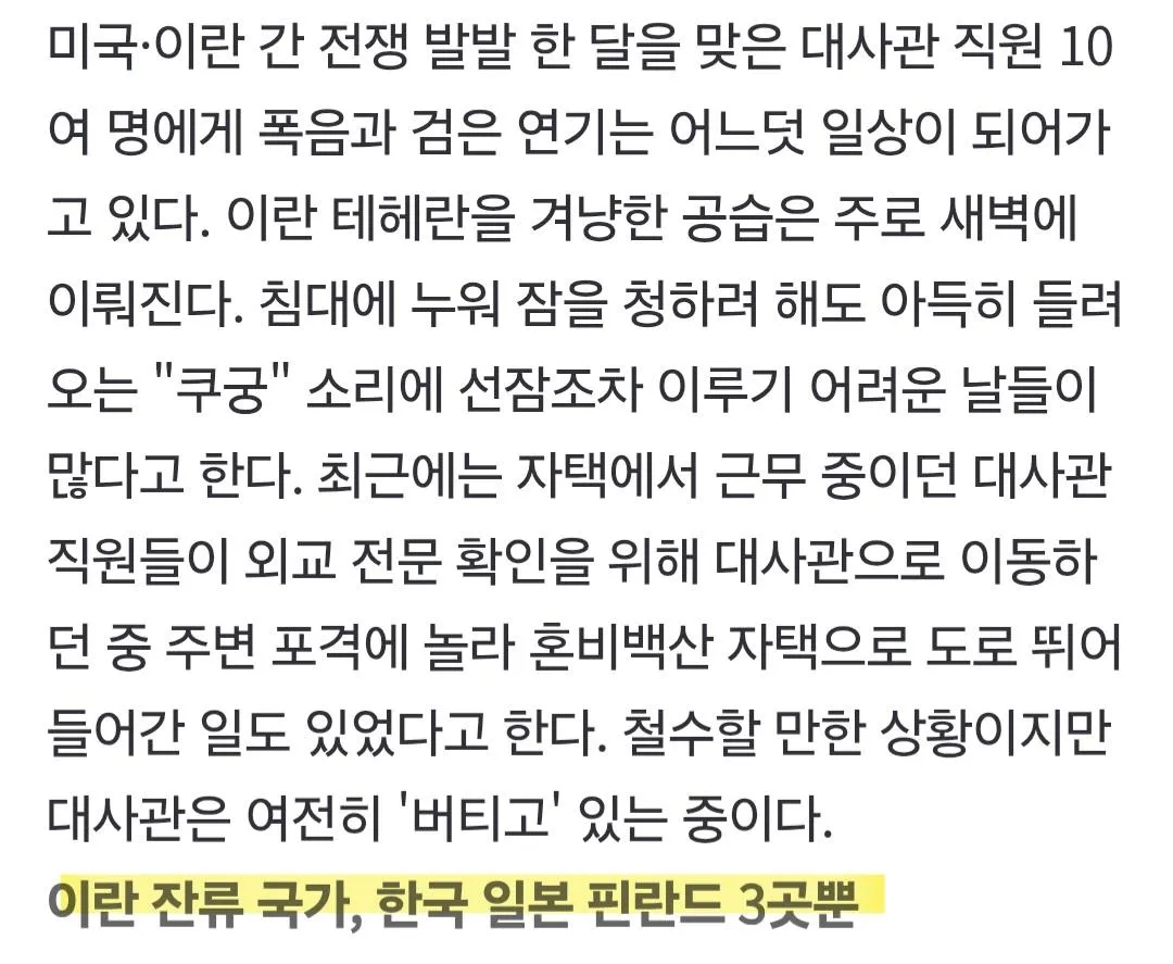 요즘 이란에 남아 버티는 한국대사관 얘기가 계속 돌던데, 진짜로 그렇게까지 버티는 거냐 싶은 기분이 든다. 새벽마다 들려오는 폭음 소리와 연기가 일상이라는 얘기를 들으면, 잠도 쉽게 못 자고 불안한 분위기가 스민다. 직접 확인은 어렵지만 주변에서 들려오는 말들로 보면 직원들 컨디션이 만만치 않다는 소문이 떠돌더라. 그래도 여전히 자리를 지키고 있다는 말이 버팀목처럼 들려, 이 상황의 끝이 보이지 않는다는 생각이 머릿속을 맴돈다.