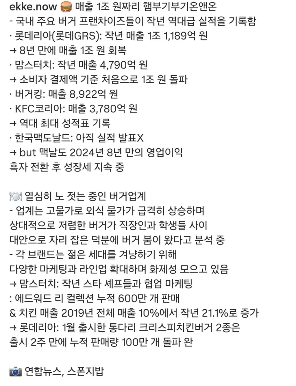 그래도 한 가지는 분명해 보인다. 버거 업계 이야기는 계속 돌아다니고 있고, 각 브랜드가 내놓는 신제품과 이벤트에 사람들의 관심이 몰리잖아. 고물가 속에서도 버거가 선택지로 남아 있는 흐름이 계속될지, 아니면 어느 순간 균형을 찾을지 아직은 미지수야. 오늘도 들려오는 소문들을 보며 나는 이 흐름의 방향을 조용히 주시하고 있어. 결국 이 업계의 실적과 마케팅 전략이 어떻게 맞물리느냐가 앞으로의 흐름을 결정하겠지.