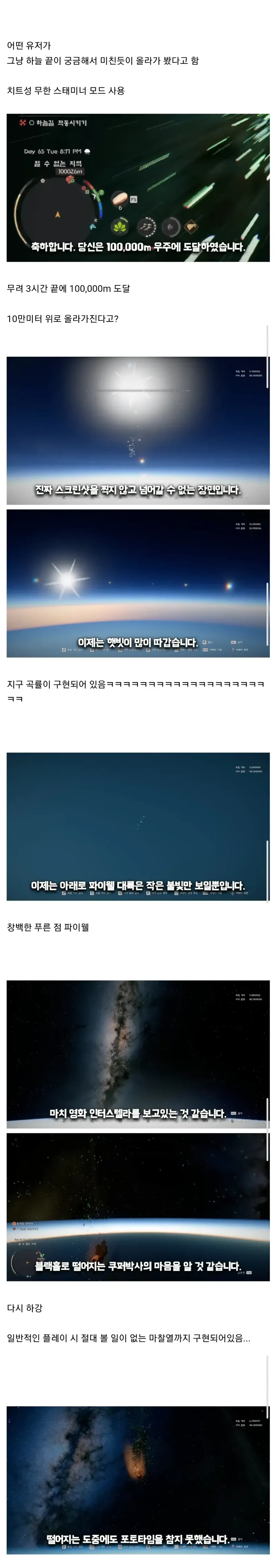 그런 기록들 사이로도 이건 그냥 재미로 보는 게 맞는 걸까 싶은 의문이 자꾸 올라와. 일부는 하늘 아래 파이웰 대륙 같은 작은 불빛이 보였다고 하고, 인터스텔라를 떠올리게 한다는 말도 들려. 또 다른 이야기는 일반 플레이로는 느낄 수 없는 마찰열 같은 요소가 실제로 구현됐다느니 하는데, 상황이 점점 더 리얼하게 느껴진다더라. 근데 이런 디테일들이 왜, 누가 남긴 걸까 하는 의심은 끝까지 남아.