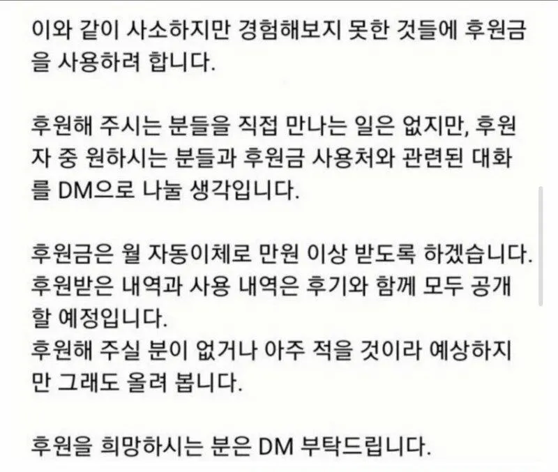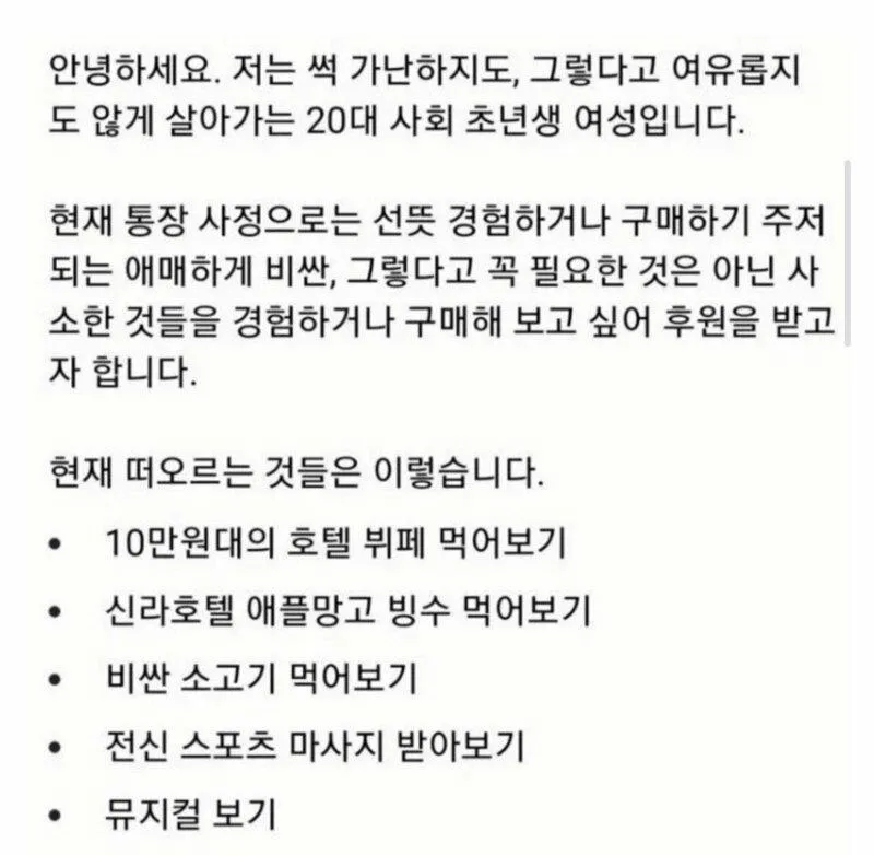 요즘 동네 커뮤니티에 퍼지는 소문 하나가 있는데, 어떤 20대 사회 초년생 여성이 후원으로 새로운 경험을 해보려 한다는 거야. 그 의도 자체는 나쁘지 않아 보이지만, 왜 이렇게까지 돈의 흐름이 머리에 맴도는지 사람들이 수근거려. 사실상 후원과 경험이 주제인데, 이걸 둘러싼 말들이 은근히 구체적인 소비 목록으로 흘러가더라.