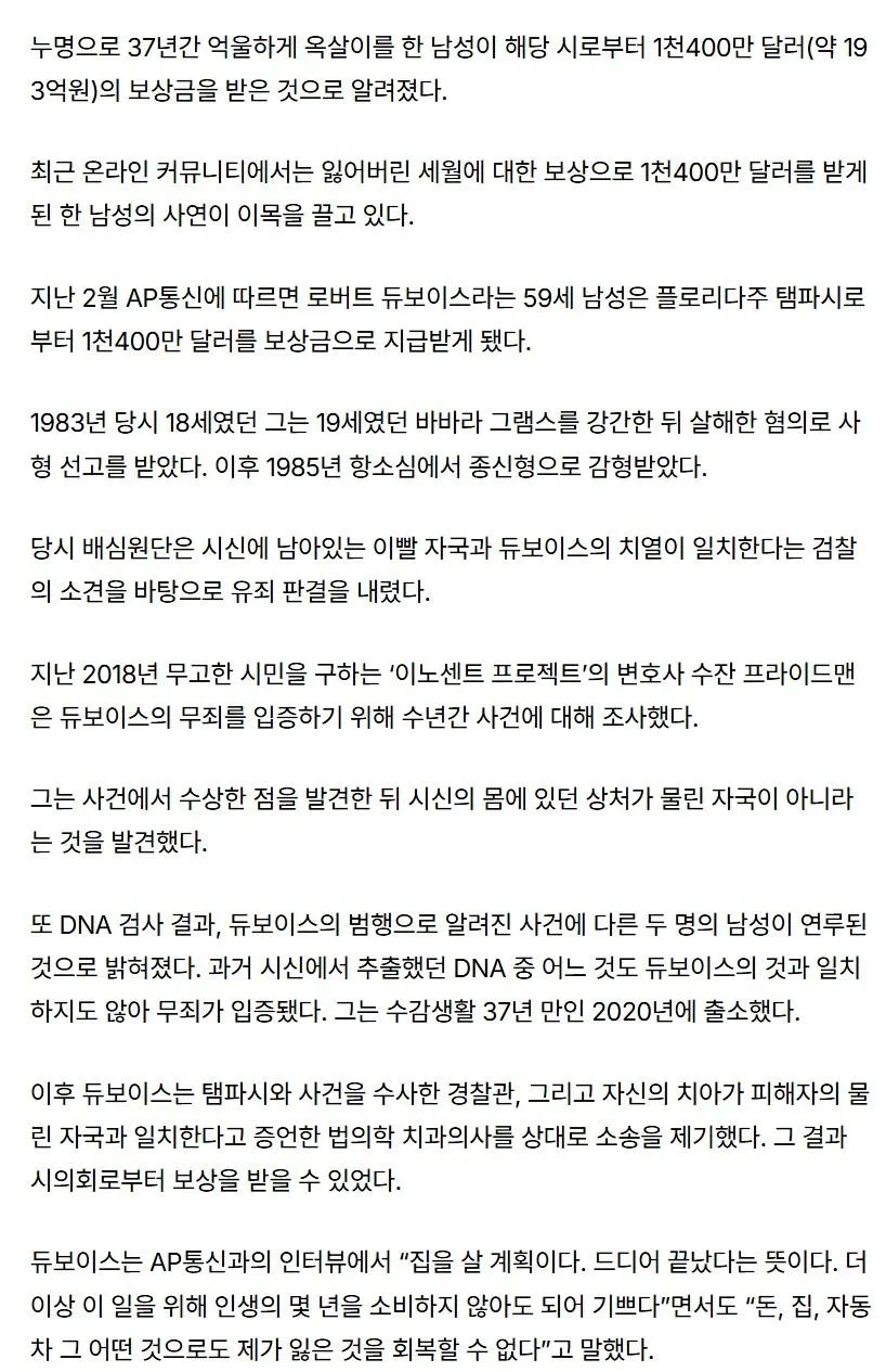 플로리다에서 억울하게 37년을 보냈다는 소문이 아직도 커뮤니티에서 회자된다. 그 이야기가 다시 불거지면서, 사람들은 어떻게 그런 일이 가능했는지 이야기꽃을 피운다. 사건과 함께 돌아다니는 보상 얘기도 함께 돌고 있는데, 과연 이 모든 게 사실일까 하는 의문이 따라다닌다. 소문 속에 남은 건 DNA 증거의 변화와 오랜 시간이 남긴 흔적, 그리고 석방으로 이어졌다는 소문도 함께 도는 점이다.