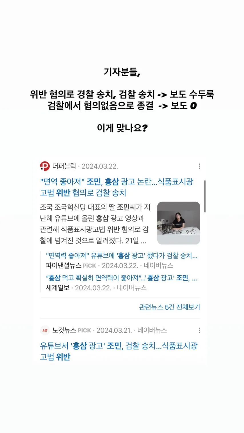 결국 이 사건은 아직 확정된 결론 없이 남아 있다. 홍삼 광고와 면역력 같은 말들이 어떻게 받아들여질지, 식품표시광고법의 기준이 어디에 닿는지에 대한 의문은 남겨둔다. 조민이라는 이름과 광고의 경계 사이에서 우리 모두의 판단은 어디에 서 있는지 아직은 미스터리다. 이 소문들이 지나가더라도 남는 건 그때의 분위기와 마음속 의심들뿐일지 모르겠다.