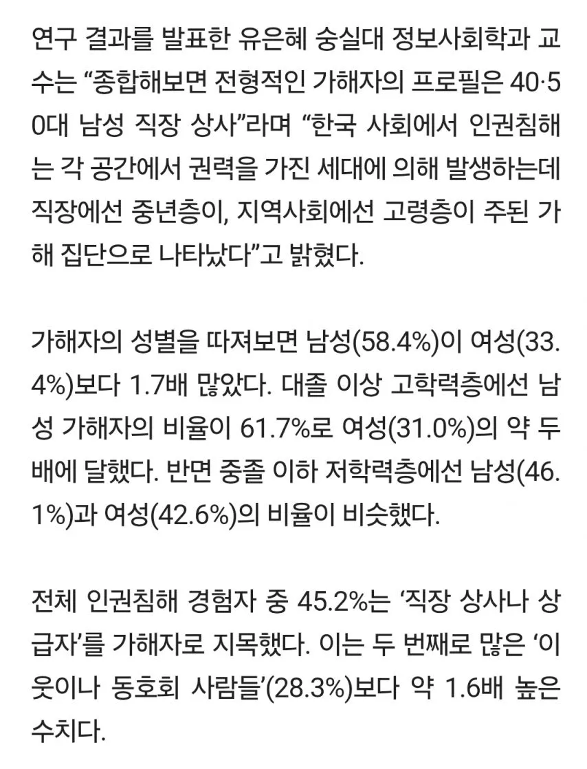 우리 팀에서 40대 남성 상사가 분위기를 좌우한다는 소문이 돌아. 직장 내 인권침해 같은 말들이 가끔 들려와서 마음이 어지럽다. 권력의 위치가 실제로 작동하는 모습이 자꾸 떠올라 불편하다. 그 흐름이 사실일지 궁금한데, 인권의식 실태조사 같은 기사 생각이 머릿속에 스쳤다.