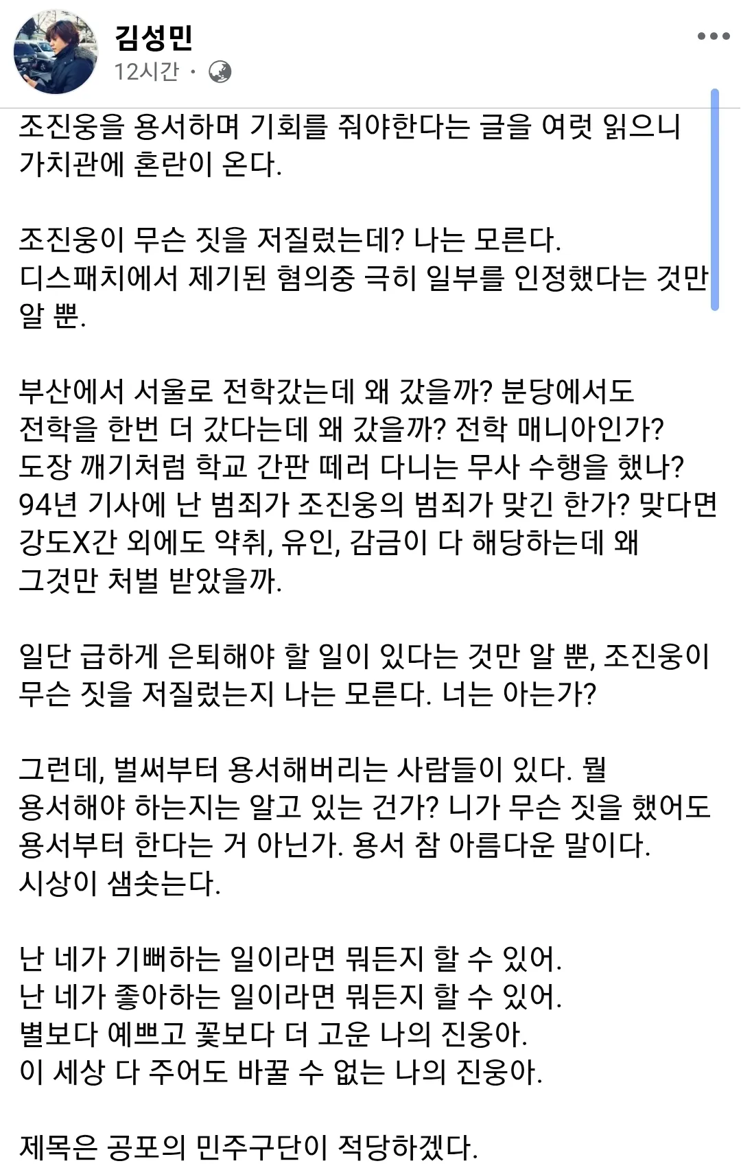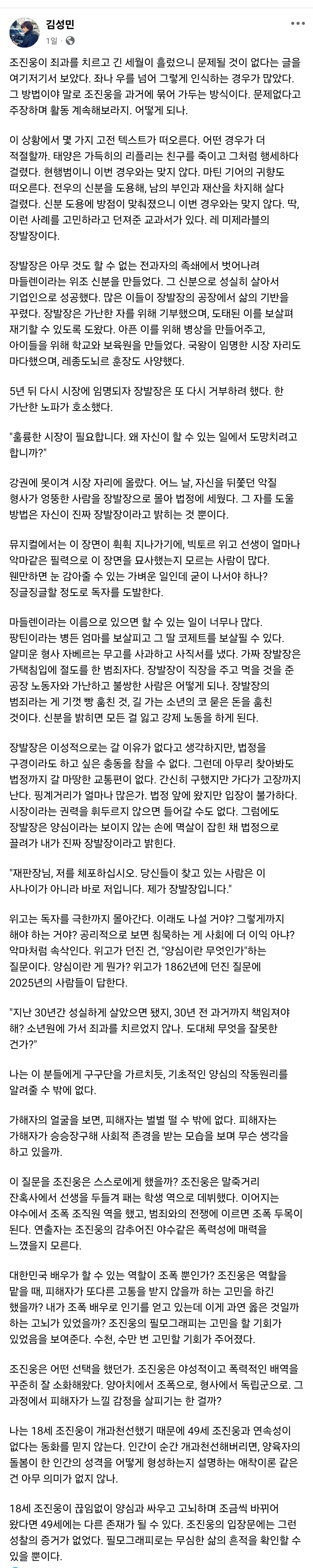 요즘 조진웅 얘기가 계속 도는데, 사람들 사이에선 과거 이슈를 아직도 두고 보는 눈이 많더라. 누군가는 그를 둘러싼 소문이 먼저 떠오르고, 누군가는 그의 연기력 자체를 다시 생각하게 된다고 해. 상황이 아직 확실치 않다 보니 확정하긴 어렵고, 그래서 더 이야기가 퍼지는 걸 보면서도 불편한 마음이 든다. 나는 이건 개인의 양심과 판단이 부딪히는 문제인 걸까 싶다.