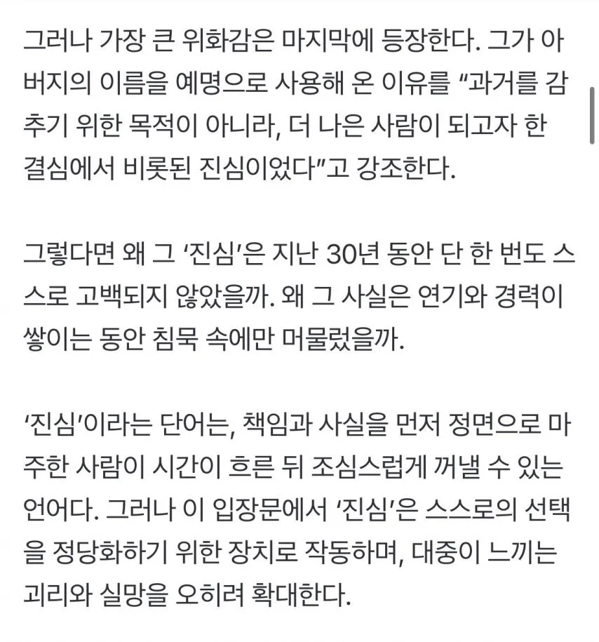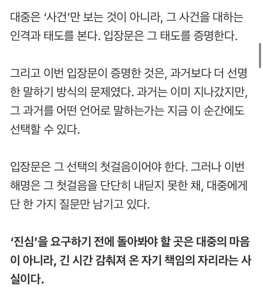 진심이라는 단어가 등장하면 무게감은 높아지지만, 그 단어가 실제로는 어떤 행동의 연속을 담아내지 못하는 경우도 있잖아. 그래서 사람들은 과거를 마주하는 태도 자체를 더 주시하게 돼. 이 상황에서 우리가 진짜로 바라는 건 명확한 책임의 목소리일 텐데, 그 시작점이 어디일지는 아직 미지의 영역인 듯해. 어쨌든 조진웅, 입장문, 과거 같은 키워드가 맥락에서 계속 돌아다니는 이상, 여론의 방향도 쉽게 굴러가진 않을 거 같아.