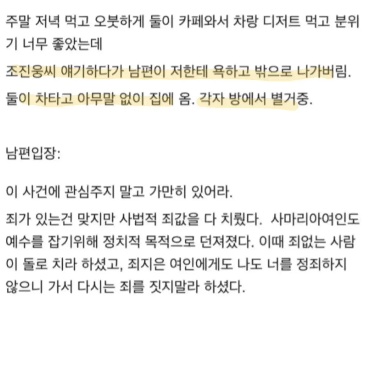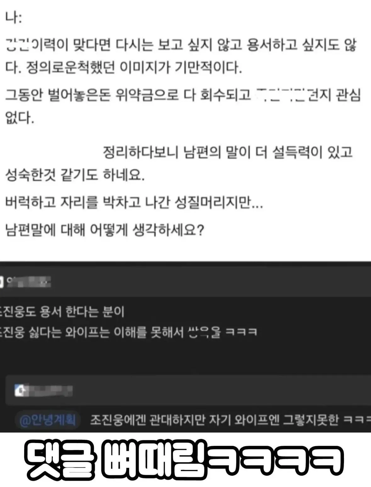 아무튼 남편 쪽의 말투나 행동은 차분하게 보이려 하고, 아내 쪽은 감정이 먼저 나오는 편이라 갈등의 파고가 깊어져 보이기도 해. 둘 다 서로를 이해하려는 듯 보이는데, 어쩐지 말들이 서로를 더 멀어지게 만든다는 느낌도 든다. 누가 옳고 누가 잘못했는지 작은 의심이 오가고, 소문을 듣는 우리도 모르게 신뢰가 흔들리는 걸 느껴.