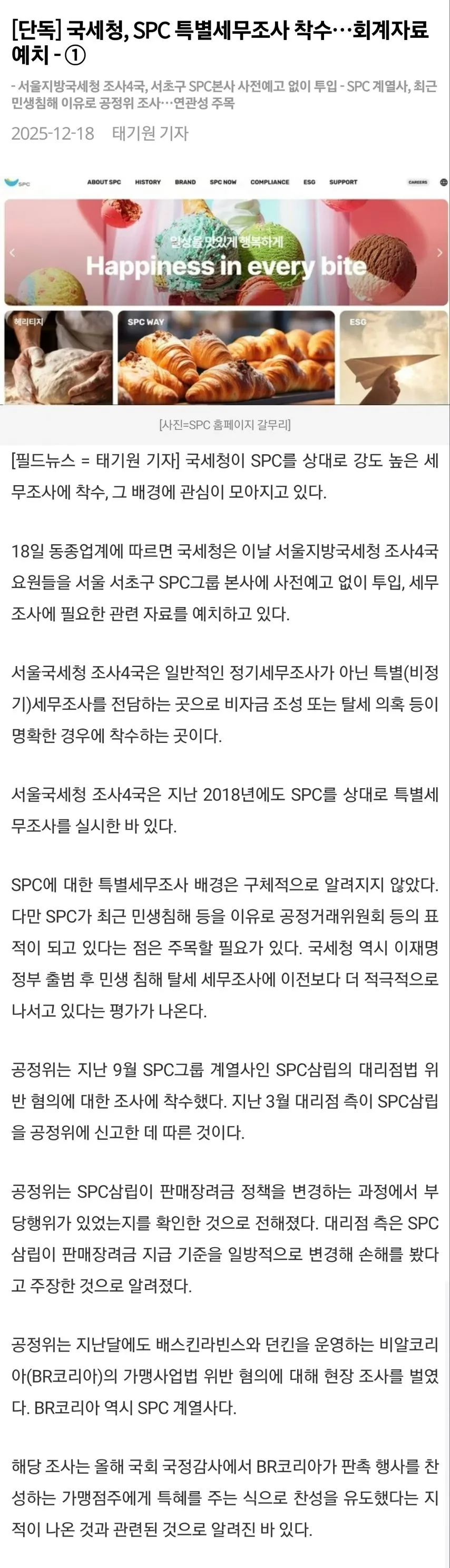 요즘 SPC 쪽 소문이 자꾸 흘러와. 국세청이 특별세무조사에 들어갔다는 말이 한동안 화두였고, 본사에 예고 없이 요원들이 들어갔다고 들었어. 세무조사의 배경은 잘 안 알려진 채로, 왜 갑자기 대대적으로 들여다보는지 의아해지는 상황이야. 민생 침해 쪽 이슈도 같이 회자되면서 분위기가 심상치 않다 느껴져.