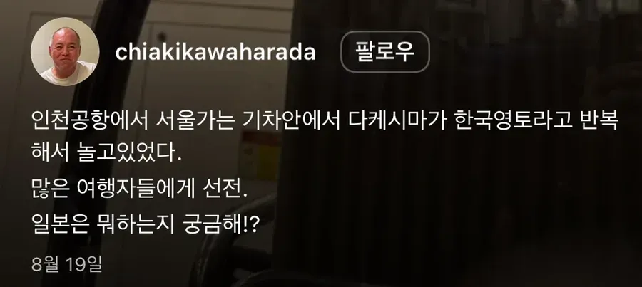 오늘 오전 열차 안에서 독도 얘기가 자꾸 귀에 들어와 머리가 복잡해졌다. 방송 쪽 소리가 자주 들려왔고, 나는 그게 어디서부터 시작된 건지 몰랐다. 다케시마라는 이름도 함께 흘러나와 분위기가 한층 더 어색해졌다. 그냥 여행 분위기 챙기려는 광고일 수도 있겠다 생각했지만, 뭔가 확실히 다른 뉘앙스가 남았다.