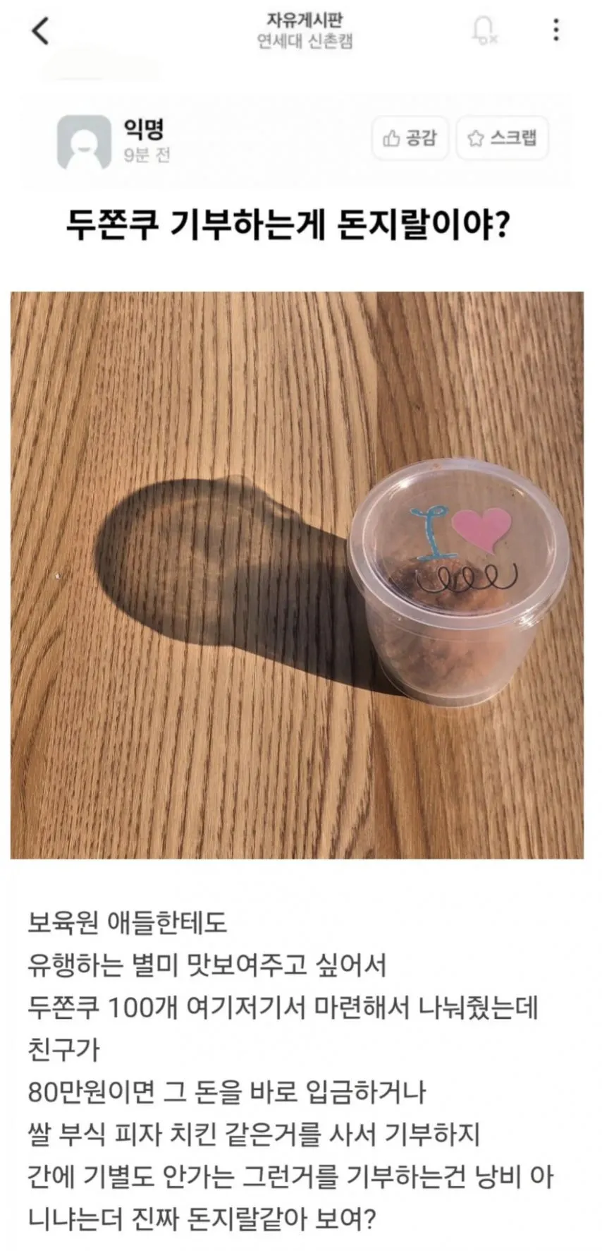 보육원 간식 기부 얘기가 커뮤니티에서 자꾸 화제가 되더라. 두쫀쿠라는 간식을 누군가 나눠줬다는 소식이 퍼지면서 분위기가 확 갈리기 시작했고. 사진이 따라오고 글이 섞여 올라오니 서로 다른 해석이 난무하는 느낌이야. 이건 선의에서 나온 행동일까, 아니면 다른 숨은 의도가 있는 걸까 궁금해지기 시작했어.
