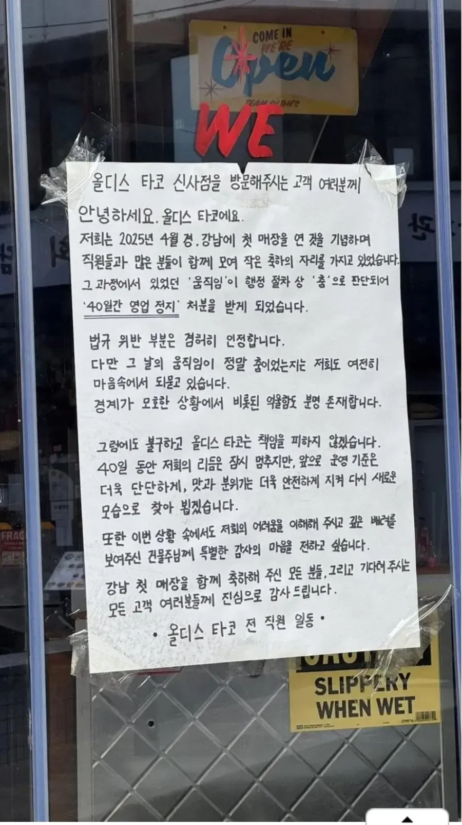 그런 기간이 실제로 흘렀다는 얘기도 들려와서 영업정지의 그림자가 아직 남아 있는 느낌이야. 춤으로 판단됐다는 그 움직임이 법규 위반으로 귀결되는 건지, 여전히 의문이 남아 있어. 그렇다고 끝난 건 아니라서, 규정 해석이나 행정 절차가 어떻게 흘러갈지 궁금한 마음은 남아. 한편으로는 우리 동네의 분위기가 이슈를 어떻게 다루는지, 서로의 시선이 어떻게 갈리는지 계속 궁금하네.