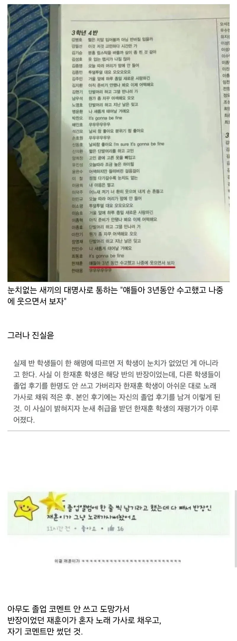 들리는 말로는 졸업앨범의 한 칸이 특정 누구의 의도 아래 채워진 걸로 전해지나봐. 반장 역할을 했던 누군가가 그걸 주도했다는 뉘앙스도 있고, 그래서인지 서로의 시선이 예민해진 느낌이야. 사진이나 후기 글들은 조용히 삼켜지면서 대신 가사로 남겨진 이야기가 사람들 사이를 더 크게 만들고 있지. 증거가 확실치 않다 보니, 누가의 의도였다고 단정하기보다 왜 그런 선택이 만들어졌는지에 대한 추측이 난무하는 상황이야.