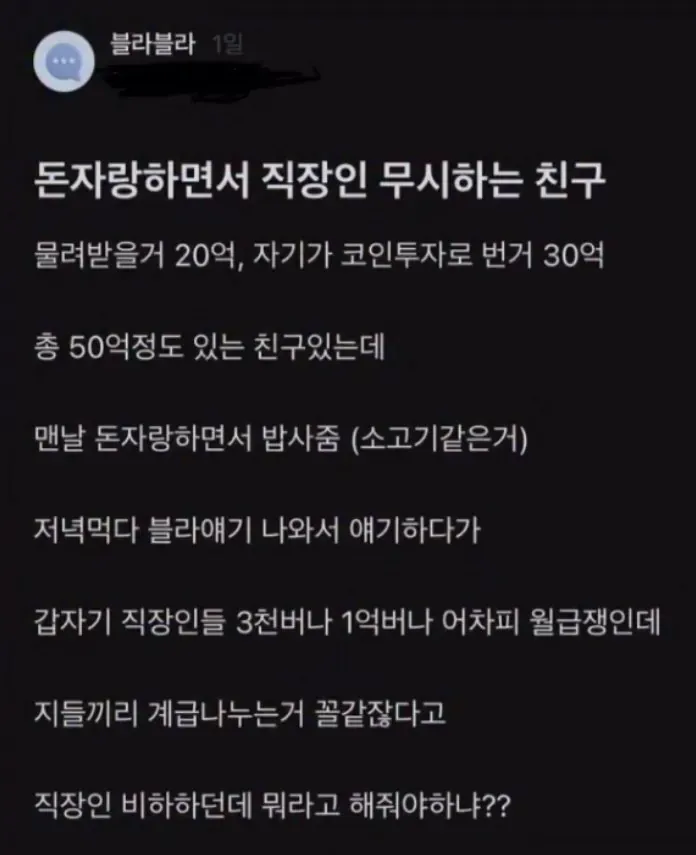 친구가 돈자랑을 자꾸 한다는 게 요즘 문제 같아. 상속으로 큰 돈을 받았다고 분위기를 보며 소리 높여 말하고, 코인투자 수익 얘기도 자주 꺼낸다. 그 과정에서 직장인 비하 같은 말도 슬쩍 섞어 나오니 분위기가 얼어버린다. 이게 과연 농담일지, 아니면 정말로 그런 생각이 스며들었는지 헷갈린다.