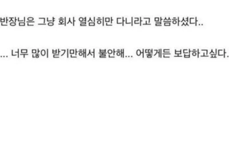 우리 팀의 반장님이 요즘 은근히 자주 챙겨주신다는 얘기가 돌고 있어. 그분이 건물주 분위기라는 소문도 섞여 다니면서 말들이 들끓지. 그래서인지 나도 모르게 은혜를 받고 있다는 느낌이 커지네.