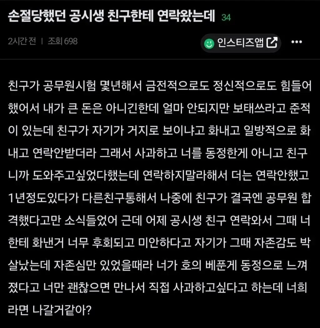 손절당했던 공시생 친구가 갑자기 연락 왔다는 소문이 모임에 퍼졌어. 그 친구가 예전에 나한테 금전적인 도움을 받았다는 얘기가 남아 있는데, 이번에 왜 이렇게 다가오는지 알 수가 없다. 합격 소식이 들려오는 등 변곡점이 생겼지만, 이 상황이 오히려 옛 감정들을 다시 건드리는 느낌이다. 그래서인지 마음이 자꾸 흔들려, 호의가 오해로 번질까 걱정이 커진다.