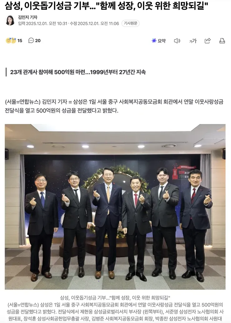 오늘 동네 게시판에 떠도는 이야기, 삼성의 500억원 규모 이웃돕기성금 소식이야. 15개 관계사가 함께 참여했다는데 전달식까지 열렸다고 하더라. 왜 이렇게 큰 기부 소식이 이렇게 빨리 퍼졌는지, 왠지 모를 뒷얘기가 떠올라서 그냥 넘길 수가 없네.