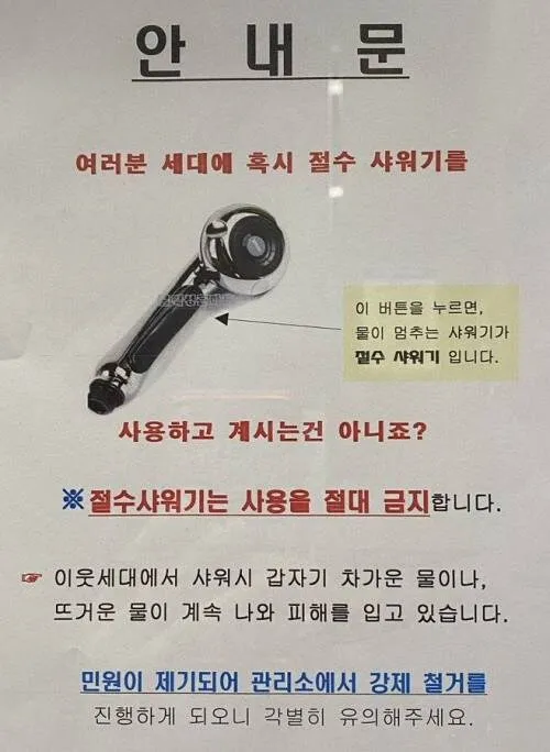 우리 동네 아파트에서 절수 샤워기 얘기가 자꾸 들려. 같은 라인에서 물이 의도치 않게 섞이거나 냉수/온수가 비정상적으로 돌아간다는 소문이야. 관리소에 민원이 접수됐다는 말도 들었고, 상황이 점점 헷갈린다는 반응이 많아. 그래서 나도 이게 정말 수압차 문제일까 하는 생각이 들더라.
