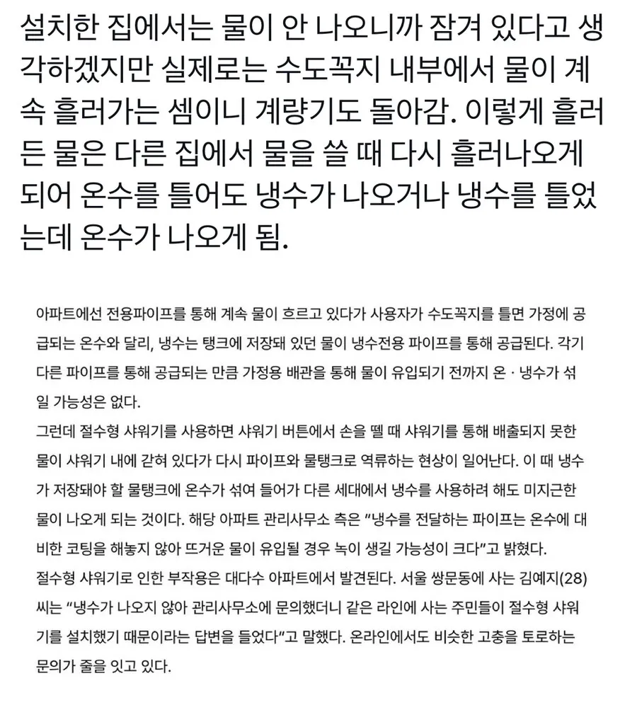 관리소가 관련 안내를 낸 모양이라는 소문도 있었고, 절수 샤워기가 수압차를 크게 키울 수 있다는 지적도 흘러다니더라. 냉수와 온수의 분리 관리가 어려운 시스템에서 작은 차이가 큰 문제로 번질 수 있다는 이야기가 또 나오고. 아무래도 다세대 주택이나 아파트의 배관 구성이 다르면 이 문제를 쉽게 해결하긴 어렵나 봐.